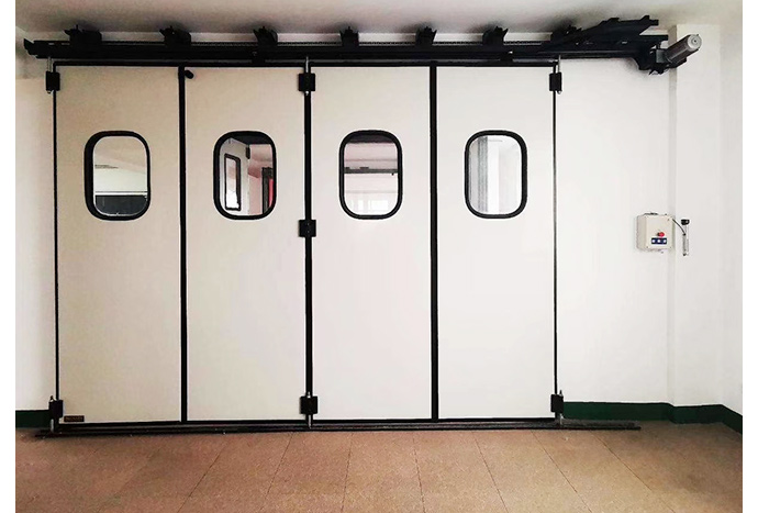 工業(yè)電動折疊門的門扇常見的四扇、六扇、八扇等,這是根據(jù)門洞的寬度來決定的。門扇又分為邊門扇和中門扇,其中邊門扇一邊的邊框與中門扇之間通過鉸鏈來進行連接,邊門扇另一邊門框的上下端則是分別裝有上、下轉(zhuǎn)軸,轉(zhuǎn)軸與門洞兩邊門框的上、下轉(zhuǎn)軸座相連接,如斯以來當邊門框繞著一邊挺旋轉(zhuǎn)時,就會同時帶動中門扇一起旋轉(zhuǎn)至90°,從而便門扇實現(xiàn)開啟和封閉動作。
